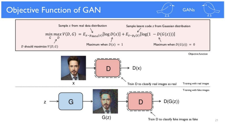 Discriminator는 CNN판별기처럼 네트워크 구성할 수 있습니다. Disciminator로 진짜 이미지는 1, 그렇지 않은 것은 0으로 학습을 시키고, z라는 랜덤백터를 넣어 Genarative학습을 시킨 이미지가 이미 학습된 D에 들어갔을때, 오로지 진짜 이미지로 판별할 수 있도록, G를 학습시키는 것입니다.