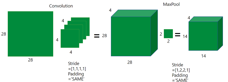 Convolution + Relu + Maxpooling을 거쳐 28*28*1을 14*14*4의 형태로 변형할 것이다.