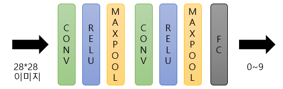 Convultion layer를 2번 거치고 Fully connected Layer로 0~9사이의 값을 판별할 것 이다.